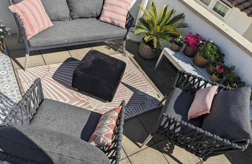 Modern duplex apartment in the center of l'Escala. There is room for 8 to 9 people in 4 bedrooms. With two terraces, a view of the Bay of Rosas and a garage with space for 2 cars, this is a luxury holiday loft.