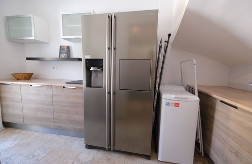 • Back kitchen with American-style fridge, washing machine, clothes horse, ironing board and iron.