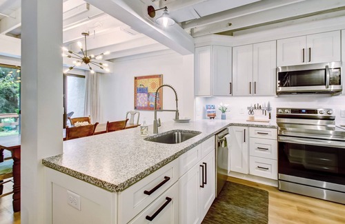 This two-story end unit is set up like a townhouse, with the kitchen, dining area, living room, half bathroom, and laundry on the downstairs level and the three bedrooms, full bathrooms, and a private balcony on the upstairs level. Sleeping arrangements are ideal for a large family or two smaller families: a king bed in the primary bedroom, a queen bed in the second bedroom, and two doubles in the third bedroom. When it's time to host, the large living/dining area opens onto a private, back patio.