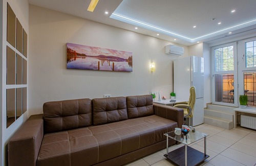 Located in the very center of the city- on the famous Khreshatyk street, there are many bars, restaurants, shops and clubs in the area. The apartment itself is new renovated, beautiful and cozy, perfect for a comfortable stay with a pleasuring Jacuzzi and Sauna! There are Smart TV's (LG TV's) in every room, including in front of the Jacuzzi! Super-comfortable king-sized bed in the living room, with a large and spacious closet, and an amazing view out the window. The living room has a fridge and a kitchen with all the appliances, cutlery and glassware you'll need. The couch is large and comfy, right in front of a Smart TV for a pleasant evening. And the view outside the balcony is fantastic!