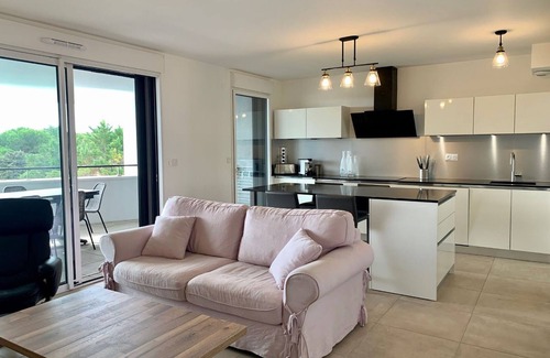 Very nice apartment of 78 m² located in a luxury residence 2 steps from the Etang de Thau and the beach of Mèze. This apartment located on the 2nd floor with elevator has a beautiful living room with an American kitchen area. fully equipped, (oven, dishwasher, hood, washing machine, combined fridge / freezer), a dining area, a relaxation area (TV + WIFI) - (Please note the sofa is not convertible), all overlooking a beautiful 21 m² terrace with stunning views of the lake. The sleeping area includes 1 bedroom with a 160 cm bed, a bedroom with 2 80 cm beds-a bathroom with walk-in shower and separate toilets. This apartment is ideal for spending a nice holiday with family and friends in a quiet area near the Etang de Thau. Animals are not allowed. NON-SMOKING accommodation - Household linen not provided.