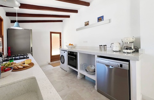 The house has been rebuilt and designed year 2024, its situated in a very peaceful street 300 meters from the Sea and the Supermarket and bakery it s just opposite. It offers a lot of privacy in a very calm and natural environment. The house is equipped up for 6 guests. Every room has his own window and view so that means the house is full of natural light, full equipped bedrooms with King size beds and one bedroom offers a 1,60m bed, all equipped with Air condition and WIFI. All bathrooms have a walk in shower and very stylish furniture. Also very practical is the outside space with the big Pool 12x7meters, outside shower, sunbeds for 6 and a big 2x2m chill out Sofa. On the backside you have a barbeceau area to enjoy nice meals at the large outside table or the cosy indoor table.The kitchen is well equipped with Smeg coffee machine, toaster and kettle, washmachine and washdisher makes your stay also comfortable. Pool towels,bedlines and bath towels are provided.