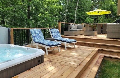 This fully restored 1930s wooden house combines vintage charm with modern comfort. Located atop a wooded lot, it offers stunning views of Lake Orford and breathtaking sunsets from the spa or terrace. A private lakeside lot with a dock provides easy swimming access. In winter, a 4x4 vehicle is recommended to reach the parking area. Perfect for a peaceful stay surrounded by nature, this chalet is ideal for relaxing and enjoying the beauty of the outdoors.