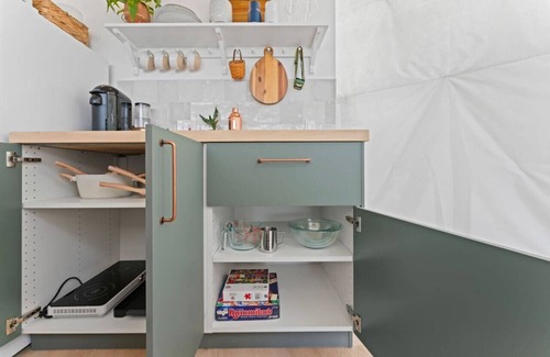 KITCHEN - Enjoy cooking with a view in our stocked kitchen. Includes fridge, toaster oven, convection cooktop w griddle, Nespresso Vertuo w coffee & espresso pods plus a Pour Over for those who want to BYOBeans. Cabinets are stocked with pots, pans, dishes, silverware, cooking and grill utensils, camping cups/coozies, wine glasses and of course coffee mugs. ** NO oven (just toaster oven)