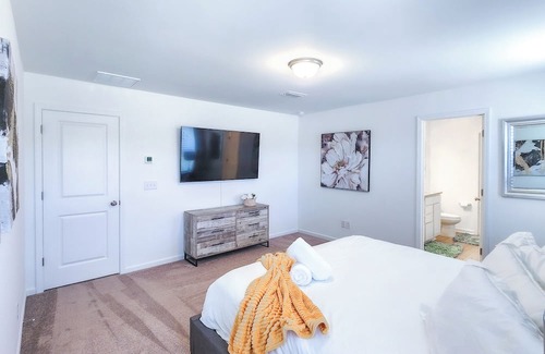 This spacious master bedroom features a luxurious king bed, large smart TV, and a walk-in closet. It has its own attached bathroom, providing privacy and convenience.