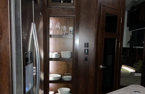 Stillwaters Edge Experience is private luxury glamping experience. The RV has a great room is with a 14ft ceiling height. Relax in one of the two leather massage chairs or lay back on the leather sofa while enjoying your fireplace and large screen television. The kitchen area has an island for meal prep and a double sink. There is a 3 burner gas stovetop and oven. The large residential fridge has a water/ice dispenser. The pantry contains basic staples & spices, pots & pans. There is a powder room on this level of the RV.