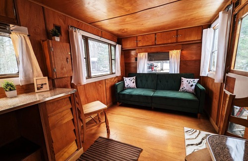 NATURE ELEVATED. ONE SEAMLESS STAY. EVERY RESORT AMENITY INCLUDED IN RATE. ONE PRICE = EVERYTHING. NO SURPRISE FEES--JUST GOOD TIMES. | This 1953 Pathfinder Vintage Camper #1 is a perfect 1950s themed getaway - sleeping 4 inside w/ a queen bed & full-sized futon. Stunning Northwoods view & short walk to easy lake access w/sandy beach. On site hiking trails, paddleboards, kayaks, canoes, game room, general store & stargazing. Boat rental & romance packages available. No pets or hookups.