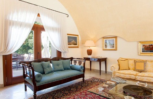 Fabulous holiday villa, embraced by a well-kept park of about 20,000 square meters, embellished by the large pool and designed with heart and intelligence by the friendly and experienced owners. The elegant residence, rises from the restructuring of a nineteenth-century villa, built in the area "cold lands", in the town of Galatina (about 15 minutes drive from the sea and close to many typical attractions of Salento). Numerous and comfortable interiors, exceptional furnishings and layout: 5 bright bedrooms, 6 excellent bathrooms, 3 charming living rooms, large kitchen with central island. Let's see the composition in detail. A characteristic dry stone wall joins the Lecce stone of the main entrance, where an automatic gate in wrought iron is supported by two imposing columns. The long driveway, bordered by trees and ornamental plants (lantana, cicas, dwarf palms, etc.), accompanies you to the monumental building on two spacious floors. The valuable property has 7 doors and windows to access the different rooms on the ground floor. From the entrances in front, depending on the point of view, you are able to see the rear doors, thus the garden and pool. Both lead through the bright and elegant furnished rooms. The central access leads to a room with a bookcase in the middle of the two spaces described above. This room, with non doors, is in the middle of the house and separates both parts giving a pleasant feeling of freedom with open spaces to live and to appreciate. The entire ground floor is well-designed and gives you enough space to enjoy the classic and historical house. The second living room is on the left hand side of the dining area and kitchen. We note a big lounge with a stone fireplace, TV and a colorful Persian rug. Another open space with vaulted ceiling is fitted with a pool table. This pool table can be transformed into a big dining table with space for up to 22 guests. The dining area between kitchen and the second living room is placed in front of the big glass door which gives you not only access to the terrace and the pool area, but also gives you and enchanting view on the rear garden. The big and well-equipped kitchen with dishwasher, an espresso machine, a fridge with freezer and a comfortable central island with seats, a sink and various storage units gives you the opportunity to cook and bake for all your gustiest or family. From the billiard you can pass through the entrance hall with the bookcase to access leads the bright and antique furnished living room. This room is decorated with beautiful furnishings, paintings and a crystal table set on a lively Persian artifact. Also, on the ground floor there is a double bedroom, with an independent exit to the garden with a bathroom with a shower and toilet en suite. Still, on the ground floor we have a second large bathroom with artistic stone sink and toilet. To the left of the pool table a staircase leads up to the first floor. Once up the stairs we have on the left side the laundry room (with washing machine, sink, iron and ironing board). Thorough the next door on the left you enter the master bedroom with a large bathroom with shower and toilet en suite. Leaving this first bedroom we enter a nice living room with sofas and 60" Television which separates all 4 bedrooms. The master bedroom has a double bed and a marble bathroom with bath and toilet en suite. Each bedroom has a doubled and its own full bathroom and is equipped with the latest generation TV. The elegant villa also amazes for its aesthetic sense and practicality in the organization of outdoor spaces. Coming out on the back of the villa a wonderful infinity pool, bordered by precious trani stone, allows a comfortable bathing in the lower part (1 mt deep) or refreshing dives in the deeper section (about 2mt). Alongside various areas for pleasant moments of relaxation we have a circular jasmine magpie, with table and chairs which is a delight to the eyes during the flowering period. On the other side there is a spacious and particular Veranda bordered by solid columns equipped with a dining table, chairs and even a sink. The sunbathing areas with umbrellas and deck chairs where you can enjoy a drink or get a tan in the warm Apulian sun are all around the pool. There is a small bathroom and two outdoor showers near the pool. Last but not the least there is the feature that makes the estate even more unique than it already is: is the presence of an inestimable archaeological treasure; the church of "Santa Maria della Porta". This Church was built in ancient times. Traditional stories recount that the holy Saint Peter passed from here on his journey to the place of his martyrdom. For the curious ones of you, we suggest reading into it. Googling the "Church of Santa Maria della Porta Galatina" will give you a lot of hits to stories etc. There are certainly a lot of valuable details of this wonderful home which we might have forgotten to tell, but it should be a real pleasure for your to find out all about it when staying in this dream villa for your special holidays. This Villa was used to shoot a video of the well-known Salento music group "Apres la classe". You can watch it on YouTube looking for "Apres la classe el presidente" (mainly outdoor spaces, swimming pool and crypt of Santa Maria) are represented here.