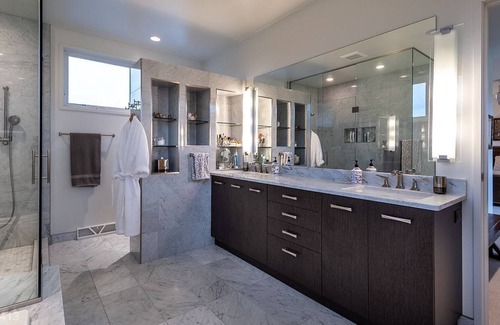 The master bathroom is one of the âwow-pointsâ of the house with nearly floor to ceiling marble walls and heated marble floors. Relax in the effervescent soaking tub and enjoy the 8 foot glass shower that can fit at least 6 people.