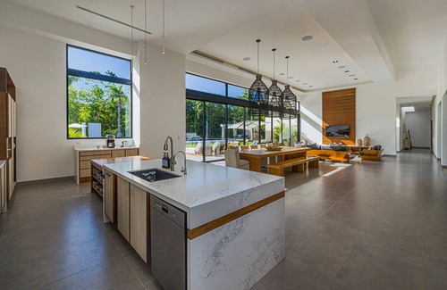 LuxuryCzoumel villas are like no other villas in Cozumel. We pay attention to details and maintain the villas to the highest level possible. A new kind of Five Star Ultra Private getaway awaits surrounded by Nature, Trees, and Open Blue Skies, just moments to the best beaches in the Caribbean. Wake up to the sounds of birds, look outside your window just to enjoy morning parakeets and butterflies playing outside your window. From the moment you enter through the private gate entrance, your oasis awaits. L’and at Mariposa is a new concept of accommodation, nestle on 5 private acres landscaped for a private retreat, more so than a villa, with nearly 8000 sq. feet of interior space – boasting 7 Bedrooms, 8 and half Bathrooms, a Great Room with enormous 5 meter high ceilings, a 22 meter Pool (72 feet long) with hot tub next to it, Pavilion, a Gym, a pickle ball court and a small Outdoor Kitchen with Grill. Thoughtfully furnished with imported design from around the world, for the ultimate experience of nature and luxury combined. It is a place to unwind, forget it all, and to enjoy quiet beauty, to create great memories with family and friends while having access to the picturesque Caribbean only a 2 to 3 minutes golf cart or bike ride away. The 7 bedrooms have 4 King Beds in 4 of the Bedrooms and 2 Queen Beds in each of our other 3 Bedrooms. Total accommodation is up to 18 adults or 22 with children.