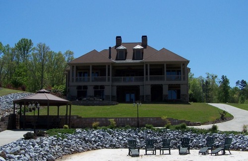 Luxury waterfront home with endless amenities. Sleeps 16 comfortably, The home features a beautiful lake front landscape with beach area and waterfront gazebo, perfect for outside fun. There is a dock that features additional room for sunbathing, fishing, or just hanging out. The Home is 9000 sq ft, plenty of room, with upper deck offering amazing views of the Mountains and Lake with wood burning fire place and lots of seating. The lower paito offers a screen porch and additional outdoor seating . Inside you will find a Large Kitchen with all the amenities, laundry room, den with gas fire logs, bar, awesome theater room with blueray DVD, game room (pool table, ping pong, foosball, air hockey or playing cards or board games), seven bedrooms ( a full mattress size bunk bed set , 3 Kings, 3 Queens, ), 4 baths. Direct TV, WIFI, and telephone. Saw