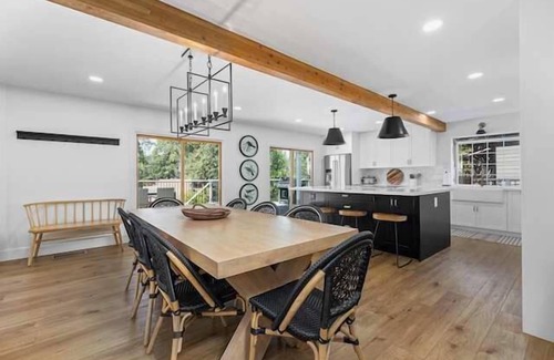 This luxurious lake house offers a comfortable and convenient stay near Bass Lake. Enjoy easy access to the lake with a private boat dock just a short walk away. Relax and unwind on the spacious deck, complete with comfortable loungers and a propane BBQ, perfect for enjoying the lake views through the trees. The fully equipped high-end kitchen is a chef's dream, featuring a wine fridge and a nugget ice maker, ideal for entertaining guests. The inviting living room provides a cozy space with a large smart TV, a gas fireplace, and a selection of board games for family entertainment. The home features six bedrooms, providing ample space for a large group. Five bedrooms are furnished with king-size beds, and the sixth bedroom is a bunk room with six bunk beds. For your convenience, the house includes a washer and dryer, along with fast and reliable WiFi.