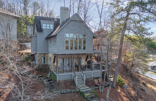 Welcome to your luxury lakefront cottage in a private gated community! This custom home on the neighborhood’s premier point lot has 5 bedrooms, 3.5 baths (sleeping for 14 guests), 2 living rooms, and boasts pristine 270 degree lake views, from nearly every room. Enjoy a true cozy lake vacation feel with designer and RH decor, private boat dock, 4 kayaks, 3 SUPs, outdoor kitchen, and Adirondack-surrounded fire pit all nestled among the trees!