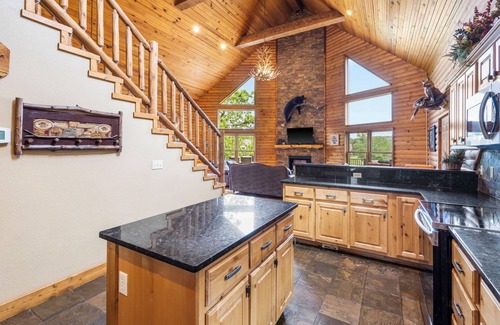 Our chalet is fully stocked with virtually everything you will need for your vacation. This is a three-level home with a full walkout basement. On the main level is the fully equipped gourmet kitchen with stainless steel appliances, seating for 8 at the dining table and another 3 at the breakfast bar. There's also a Weber Gas Grill (with propane included) located right outside on the main deck, where there is a table for 6. The living area has charming tongue-and-groove ceilings, solid log pine walls and a floor-to-ceiling Stone fireplace, complete with a wall of windows to better enjoy the view of beautiful Table Rock Lake! The two guest rooms on this level both have queen beds and share a full bath in the hall.