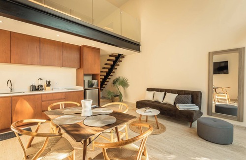 This exclusive studio is conveniently located between the town of Tulum and the beach. It is located on the first floor in a modern and unique architectural complex surrounded by tropical nature but with all the technological amenities to ensure an exclusive and comfortable stay. The space combines plenty of natural light from the floor to ceiling windows and the double height of the apartment. The fine furnishings will make you feel at home, creating a fresh, luxurious and cozy atmosphere from the first moment you arrive: