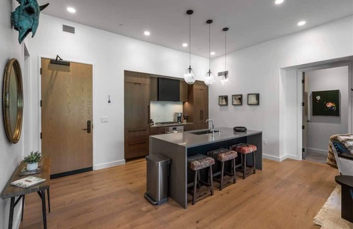 Located in Moonlight Basin`s brand-new luxury Lake Lodge, this retreat is just steps away from Ulery’s Lake and world-class skiing at Big Sky Resort. A very user-friendly trail system radiates from the doors of this property, allowing guests to bike, snowshoe, view wildlife, Nordic ski, fat tire bike, or downhill ski/snowboard with ease. Lake Lodge 213 is a two-bedroom, two-bathroom condo featuring contemporary interior design, spectacular mountain views of Lone Peak, and unparalleled access to all the new Lake Lodge amenities. This retreat has a queen bed with a shared bathroom off of the living room and private deck with seating for 4 people. The master bedroom includes a king bed and an en-suite bathroom. Not only does it have impressive views and amenities, but 213 Lake Lodge is also a fully stocked kitchen with stainless steel appliances and everything you would need to cook an incredible meal, Smart TVs, washer and dryer, Sonos speakers, air conditioning, and boot dryers. We guarantee this luxury two-bedroom home has all the small touches to make you feel right at home and make memories of a lifetime.