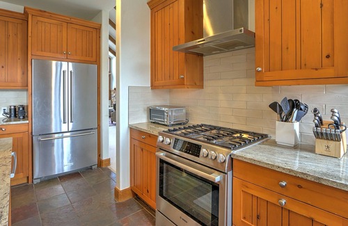 A welcoming entrance opens into a beautifully furnished living room with vaulted ceilings, exposed beams, floor to ceiling windows and a gas fireplace. The gourmet kitchen boasts bright granite counters, stainless steel appliances, and is fully stocked with a variety of tools to satisfy the most discerning chef. Enjoy a warm cup of coffee in the breakfast nook or choose to dine at the stylish dining table, both with Mount Sopris views!