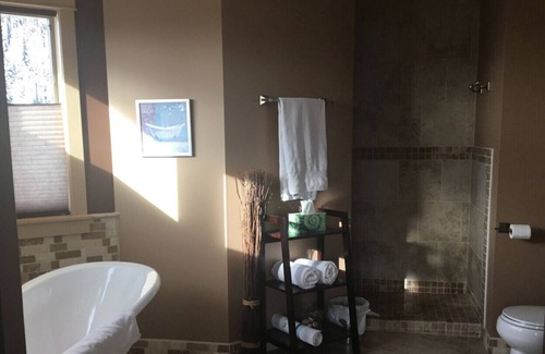 Large master bedrooms (all beds are high quality mattresses for a great nights sleep),electric Fireplace, private deck, ensuites have claw foot tubs, double sinks and large walk in showers.