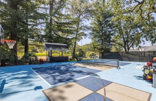 Outdoor spaces: between 75 olive trees, 2.5 acres of planted cabernet grapes (it is a working farm), vegetable gardens, towering redwood groves throughout the property (unique in Napa Valley). A small playground for kids, a trampoline, a pickleball court which doubles as a basketball, dodgeball, and 4-square court. And paddleboards and lake activities are abundant on this luxurious property.