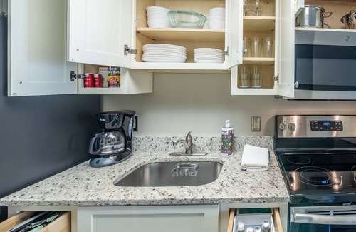 The kitchen has granite countertops and all new stainless steel appliances including a full size refrigerator with ice maker, four burner stove and oven. If you want to stay in and cook we have everything you need including pots, skillets, colander, cutting board, bowls, mugs, glasses, wine glasses, coffee pot and service for eight.