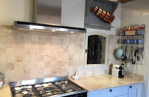 Elegantly decorated in Provençal style and furnished with both new and antique pieces the oak floors in the spacious living, dining and bedrooms combine well with the exposed stone walls. The bedrooms have large comfortable hotel quality beds made up with crisp cotton sheets. Each bedroom has a private ensuite with large shower, white fluffy towels and adequate storage. The kitchen has classic timber and travertine finishes and is well equipped for self catering with modern appliances and large gas cooker.