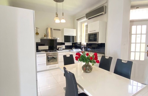 Large L-shaped apartment, very bright, (with 16 large windows) of 158 meters with two princely bedrooms, reading room with computer screen and printer, large entrance hall, large U-shaped kitchen, large room with balcony, two bathrooms one with shower and the other with a finely finished bathtub. The apartment is located on the fifth floor with a splendid view. All the accessories are characterized by minimalist luxury. An exclusive and romantic environment suitable for a holiday dedicated to luxury and romance.