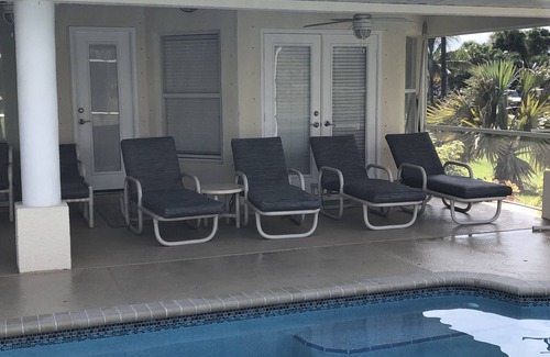The large screened-in Lanai also has 3 ceiling fans to keep a breeze, an electric-heated saltwater pool, a jet spa (heated marginally above pool temperature), and a cushioned dining set for 10 in addition to 4 pool loungers. The lanai has numerous spots to relax in the sun or shade during the day. There are clear views of the golf course and the stars at night. You can also see NASA launching space rockets from the lanai at night if your timing aligns!