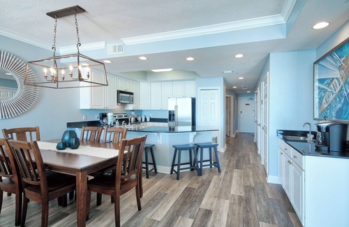 The fully-equipped kitchen & large dining area allow meal preparation and dining while viewing the Gulf through the wall to wall windows in the family room.