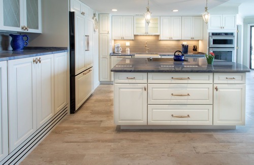 The state-of-the-art Gourmet Kitchen countertops are Azul Imperial quartzite, a stunning and unique five star azure blue stone which establishes the ocean/beach decorative theme of the unit. The cabinetry has glass door accents, roll out shelves, double tiered silverware drawer, and many other customized features. The Gourmet Kitchen also includes a fireclay farmhouse sink; Le Creuset and All-Clad cookware; island with countertop and seating for two; and luxury appliances including a 36 inch paneled refrigerator with ice maker; oven and microwave combination; beverage cooler; paneled dishwasher, and brand new (2024) front load washer and dryer.