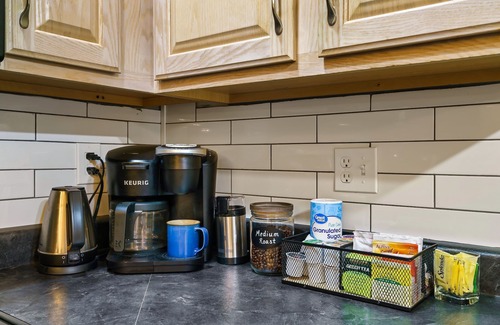 The full kitchen is open to the main living area. Here you’ll find all the tools and appliances you need to feed your group, including high-end pots and pans, dishes and cutlery, dishwasher pods and dish soap, basic spices, and a convenient beverage bar stocked with coffee, tea, and hot chocolate. There’s enough room here for kids and other members of your group to assist the cook, too, so meal-making can be a family affair.