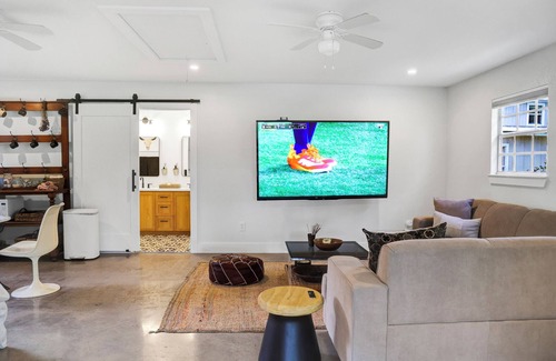 There's an 84" TV with Apple TV and a large, L-shaped sofa to curl up on to watch your favorite shows.