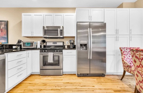 This gorgeous New England luxury home accommodates 12 guests in 4 bedrooms. The master bedroom is located on the top floor, outfitted with a SmartHDTV and an eloquent ensuite full bathroom. Down the hall, you'll find 2 more bedrooms once you've passed the shared full bathroom (equipped with a tub/shower combo). One of the bedrooms has a queen bed and another TV for your enjoyment. The next bedroom, thoughtfully designed, has a twin over full bunk, with a twin trundle below and a TV! The final bedroom can be found downstairs on the first floor off the 2nd of 2 living rooms. The downstairs bedroom has a bunk bed (twin over twin) with a twin trundle below and another TV. The utmost thought and consideration were put towards the design and layout to maximize the space for guests, while also delivering a high-end experience that is worthy of 5 stars!