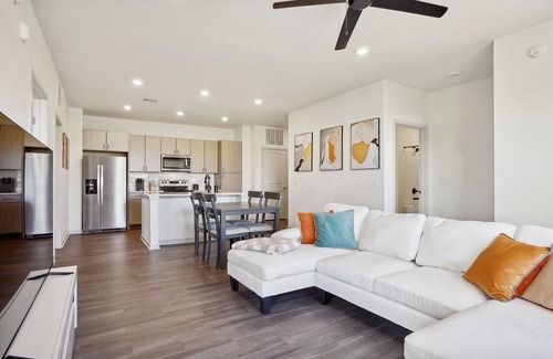 This large 1,174 Square foot 2-bedroom luxury apartment has two bathrooms, an in-unit washer and dryer, central AC and heating, a filtered water dispenser, and a fully equipped kitchen (all pots, pans, plates, cups, utensils, etc. are included) desk for business travellers and is great for short or long stays
