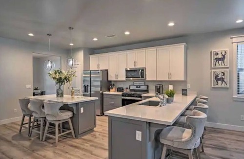 This is our brand new vacation house that we would love to share with you. Everything in the home is NEW (Furniture, beds, mattresses, bedding, towels, kitchen appliances). First floor open floor design with tons of seating areas to entertain and great sound system. Master Bedroom w Full bathroom, HD TV on First Floor. Upstairs Loft/2nd living Room with huge couch/bed, full size bed and HD TV. 2 bedrooms Upstairs with queen beds and Jack and Jill bathroom. Powder room on first floor. Three 55 inch HD TVs.