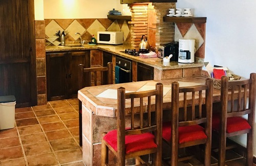 El Rancho is a luxury holiday retreat established for over 14 years, set in the heart of the Andalucian countryside, surrounded by 4 acres of private organic olive groves, with views of pine clad mountains. The Organic olive farm has exclusive equestrian facilities, complete with 20m x 40m professional dressage arena and offers 3 luxury self catering villas. All the cottages are beautifully designed with landscaped gardens and terraces. We have 2 swimming pools ( main pool 20ft x 40ft) with vast terraces and numerous comfortable sun beds with cushions and umbrellas and side tables. There is ample space so families and couples can easily have their own zones. We also offer a heated jacuzzi. ( available April - October) All the villas have private dinning and sunbathing terraces and have been individually designed and lovingly furnished in a typically Andalucian style, to the highest standards. The villas are equipped with their own fibre optic internet and have eco friendly pellet burners to give heating during the cooler months. An ideal retreat for couples and families of all ages anytime of the year, seeking a relaxing holiday. Ideally located for sightseeing, (Antequera, Granada, Alhambra Palace, Ronda, Seville, Sierra Nevada) only 40 mins from the the beaches of the Costa del Sol and only 20 mins from the beautiful beaches of the fresh water lake of Iznajar. The traditional village of Villanueva del Trabuco has numerous tapas bars and good restaurants offering a wealth of local cuisine and varied wine lists, all just only 5 minutes away. Bedroom 1 consists of 1 kingsize bed and fitted wardrobes, ceiling fan and en-suite bathroom. Bedroom 2 consists of 2 single beds, complete with bedside cabinets and fitted wardobes, ceiling fan and en-suite bathroom. Bathrooms, both en-suite luxury bathrooms feature ganite vanity units, shower cubicles and wc. Fully fitted kitchen, with granite work surfaces, full size fridge/freezer, gas hob and electric oven and Nespresso coffee machine. The kitchen is fully equipped with quality cooking utensils and glassware and BBQ utensils. Lounge/dining area, fully furnished with comfortable sofas and dining furniture, Eco pellet burner, provides heating, pellets provided at no extra cost, DVD player, blue tooth portable speaker and ceiling fan. Private landscaped terrace with shaded eating area, complete with outside kitchen and built in gas barbecue, ideal for eating alfresco, full wooden dining table and chairs, and sunloungers. Bed linen and all towels are provided including pool towels. Baby cot with quality mattress and bed linen and high chair provided free upon request.