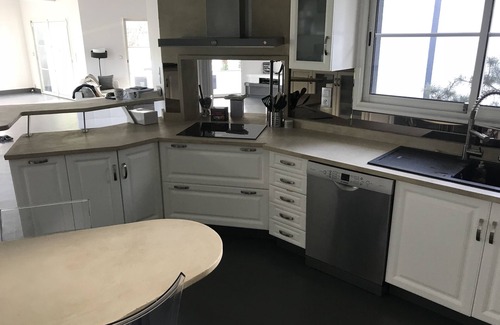 Luxury villa siué near the Bassin d'Arcachon and 20 minutes from Bordeaux, with an area of 250 m2 with 1.3 hectares of enclosed park in the heart of a forest, not overlooked, including 6 bedrooms (bedroom 1 bed 180 * 200, bedroom 2: bed 160 * 200, bedroom 3: bed 140 * 190, bedroom 4: bunk bed, bedroom 5: bunk bed, bedroom 6: bed with drawer 2 places), 2 bathrooms, 2 toilet, an open kitchen equipped (plates, microwave, oven, dishwasher), a living room with sofa and table for 10-12 adults. Quality services with waxed concrete, 4 televisions, dvd, xbox, internet, workshop with washing machine + dryer