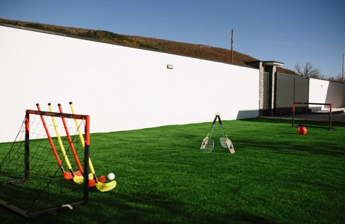 The fenced estate with high walls and a gated entrance guarantees peace and security. Enjoy a private and heated saltwater pool (10 x 4 m) with sun loungers, umbrellas, and a solar shower, as well as a jet-pool for four people. There is also an outdoor bar with a counter, a barbecue, and an outdoor toilet, perfect for social gatherings. Both houses are air-conditioned and equipped with high-speed WiFi. The first house features a living room with a sofa bed (suitable for two children or one adult), a fully equipped kitchen (stove, oven, refrigerator), a bedroom with a double bed, and a bathroom. The second, larger house includes a living room with a sofa bed, a kitchen with a dishwasher, a dining area, three bedrooms (two with double beds and one with a single bed), and a bathroom. A washing machine is available in a separate room next to the first house. Guests can enjoy cotton towels, premium bedding, and flat-screen TVs with satellite channels in both houses. For additional entertainment, there is a private sports field for mini football, volleyball, badminton, and field hockey. Free covered private parking is also provided.