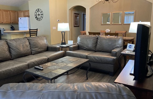 Our four bedroom three bathroom villa offers an open concept living area that is very spacious and tastefully decorated for guests. There are two master en suite bedrooms (1 King 1 Queen)each with brand new pillow top mattresses, with the third and fourth bedroom sharing a full Jack and Jill bathroom that sleeps 9 comfortably. Our home comes with a fully equipped kitchen, dining area, flat screen TV and full size washer and dryer. The garage is transformed into the ultimate games room equipped with pool table, foosball, air hockey, and electronic dart board.