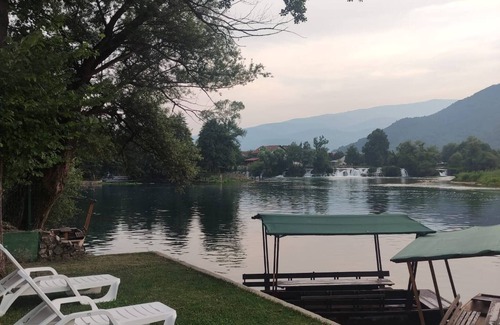 Welcome to the luxurious villa on the river Una, a perfect spot for a tranquil holiday or business retreat. This comfortable and spacious property offers stunning views of the waterfall and surrounding countryside. The villa is well-equipped with modern amenities, including a fully air-conditioned and heated guesthouse. Enclosed gardens and terraces provide plenty of space to relax and enjoy life's pleasures. Whether you're looking for relaxation or work space, this wonderful villa has it all.
