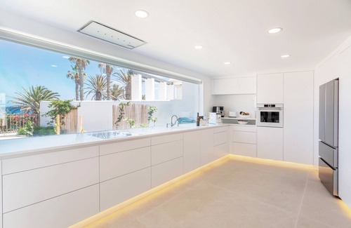 The spacious open-plan living and dining area offers breathtaking sea views, with large patio doors leading to the partially covered terrace. Perfect for self-catering, the modern bespoke kitchen is fully equipped with an oven, hob, grill, dishwasher, fridge, freezer, and microwave. Double doors from this light-filled room open to the terrace and outdoor dining area. Enjoy amenities such as free WiFi, a flat-screen TV. If you have Netflix, you can log in to your account.