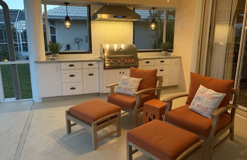 All 5 start review southwest cape waterfront vacation home. Newly remodeled 3 bedroom, 2-1/2 bath, private home in desirable cape harbour area community. New open concept kitchen with large granite island, brand new appliances and all new furniture . Large glass doors fully-open to the beautiful pool and lanai providing 3000+ square feet of living and entertaining space. Outdoor kitchen with new professional grill and exhaust hood. Swim in the private heated pool with ambient lighting, watch TV on any of the three new HDTVs, keep in touch with friends (or work) with high speed WIFI; Sunbathe in the screened lanai or along the canal deck; Rent a boat from the Cape Harbour marina and boat to the gulf, Sanibel and Fort Myers Beach. Walk, bike, or boat to Cape Harbour for European style shopping, fantastic restaurants, bars, and entertainment. Cape Harbor Villa is your perfect Florida vacation choice!