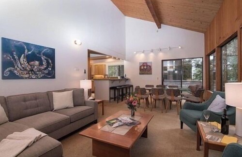 Second (main) Floor: Entry, full living room: sofa and seating, woodstove, TV/VCR; One bedroom: 1 queen bed; Kitchen, dining area, bathroom with large tub/shower, access to deck and hot tub. The full kitchen is up to date, with all stainless steel appliances, and is open to the living and dining room.