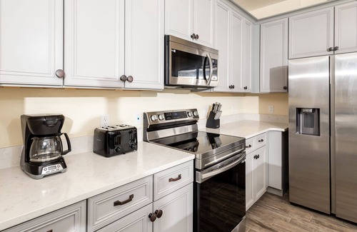 The home is beautifully designed and furnished utilizing calming neutral tones to create a sense of peace throughout. The cozy living room includes a comfortable sofa and smart TV where you’ll never have to worry about missing an episode of your favorite show while away. The bright and airy kitchen features glossy white granite countertops and brand-new stainless steel appliances, with drip coffee maker, toaster, and your very own margarita machine! Have fun experimenting with different flavors and varieties, taking your concoctions on the back patio to lounge and enjoy the view in the Adirondack seating. For formal meals or gathering the group together for a night of games, the classic dining room table can accommodate 7, while 4 additional countertop seats are perfect for small bites or a spread of afternoon appetizers.