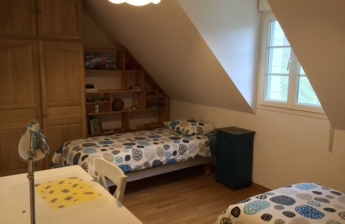 Upstairs 4 spacious bedrooms: bedroom n ° 1 with a large 160 bed, bedroom n ° 2 with a 140 bed, bedroom n ° 3 and 4: 2 single beds 90 in one bed, 2 bathrooms one with shower and the other with large corner bath, two toilets and a library mezzanine with lounge.