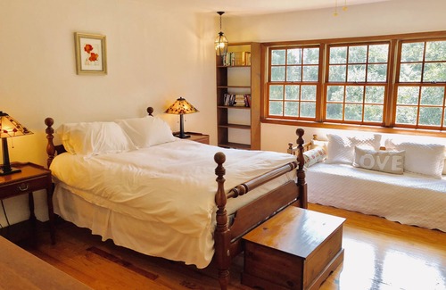 This is a five bedroom, six bath home that spans four impressive stories embracing incorporating simple elegance and family heirlooms. You will have a four poster queen bed in the master, a queen log cabin style bed in the second, ground floor bedroom, twin daybed with a popup trundle underneath and three additional twin beds in the third bedroom, a library/office, and a spacious living and dining area with a massive, reclaimed wood farmhouse table that accommodates many. In the guest home, you will have an antique four poster queen bed and a vintage sleeping couch with two twin options in one bedroom, an antique four poster queen bed and three twin beds in the second bedroom, and a large dining and living area. Our home has the perfect design for family and friends to gather together, but also to have plenty of space to rest and recharge.