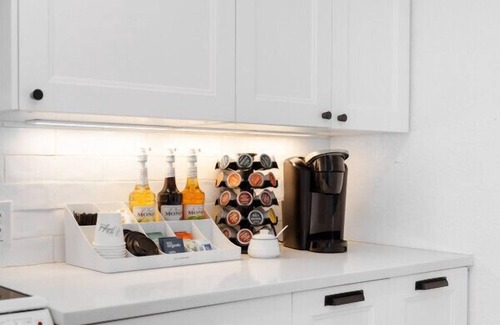 Cozy/living room and kitchen combination for enjoying time together. Great nooks all around for reading or getting away. Perfect coffee/tea bar set up for relaxation. This unit is perfect for any get away.