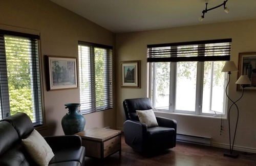 Beautiful waterfront luxury house with private beach, inclusive of a tennis court, heated pool, sailboat, kayaks,pedle boat, fishing boat and canoe. 3 bedrooms, 2 living rooms, 2 bathrooms, fully equipped kitchen, deck, balcony, terrace, outside fire places, huge playground and entertainment room. 10 minutes away from all services. Guided tours and fishing guide also available on demand. Add 15% taxes to the amount CITQ numéro d’établissement 298738- 4 stars.