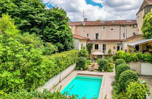 Outside, steps lead down to a verdant walled garden with a gorgeous swimming pool with a poolside terrace with sun loungers and a barbecue for al-fresco dining. That said, you may prefer to simply wander and enjoy Riberac’s inviting restaurants including a pretty cafe-bistro across the opposite side of the square with tables and chairs set out beneath the shady trees.