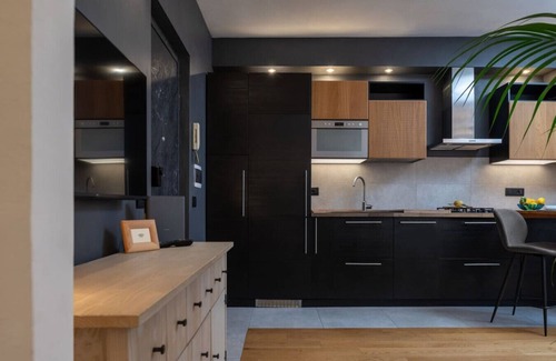 Questo elegante bilocale di 42m² offre spazi ben organizzati con arredi moderni, funzionali e di design. Il soggiorno è dotato di un comodo divano letto matrimoniale, Smart TV, un ampio tavolo penisola perfetto anche per il lavoro con computer e una cucina moderna e completamente attrezzata con lavastoviglie, forno grill-microonde, tostapane e macchina da caffè Nespresso. È presente una lavasciuga, WiFi in fibra ultra veloce ed ethernet, ferro e asse da stiro.