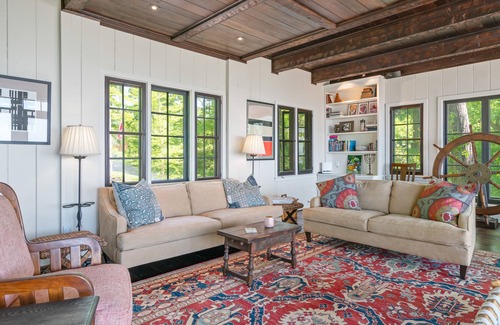 With three sitting rooms on the main floor there is space for everyone to enjoy games, reading or TV. The large living area/family room is south facing with plenty of seating and a waterfront view. Watch TV on the flat screen in the that is open to the kitchen and allows social time while preparing meals. A large screened in sunroom provides the wonderful feeling of outdoors and has and additional TV. Enjoy dinner in the formal dining room or outside on the expansive waterfront patio.